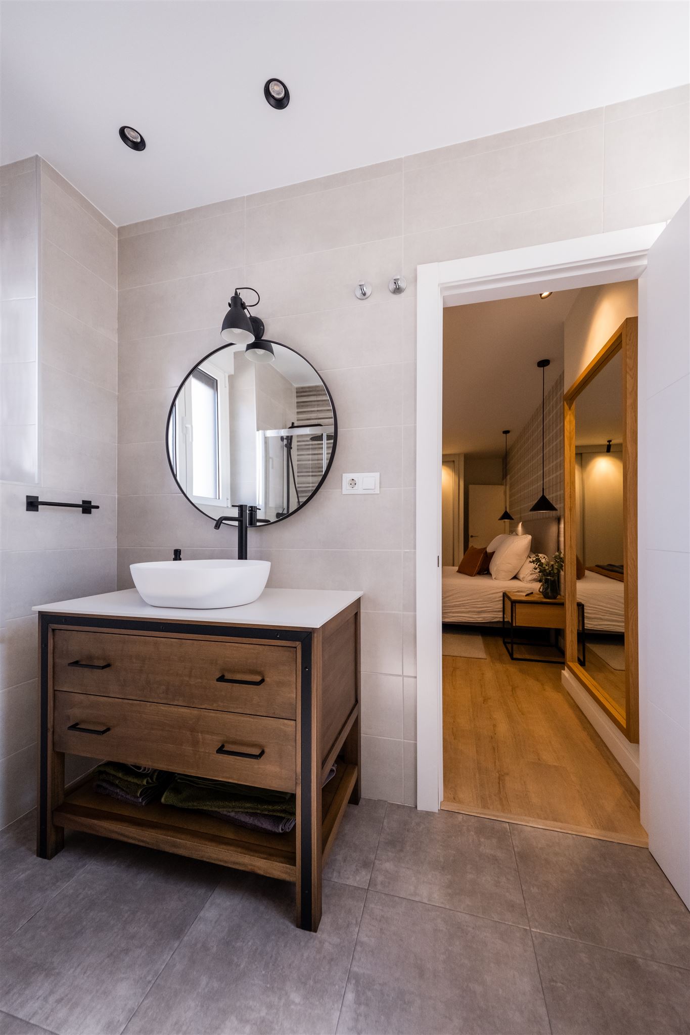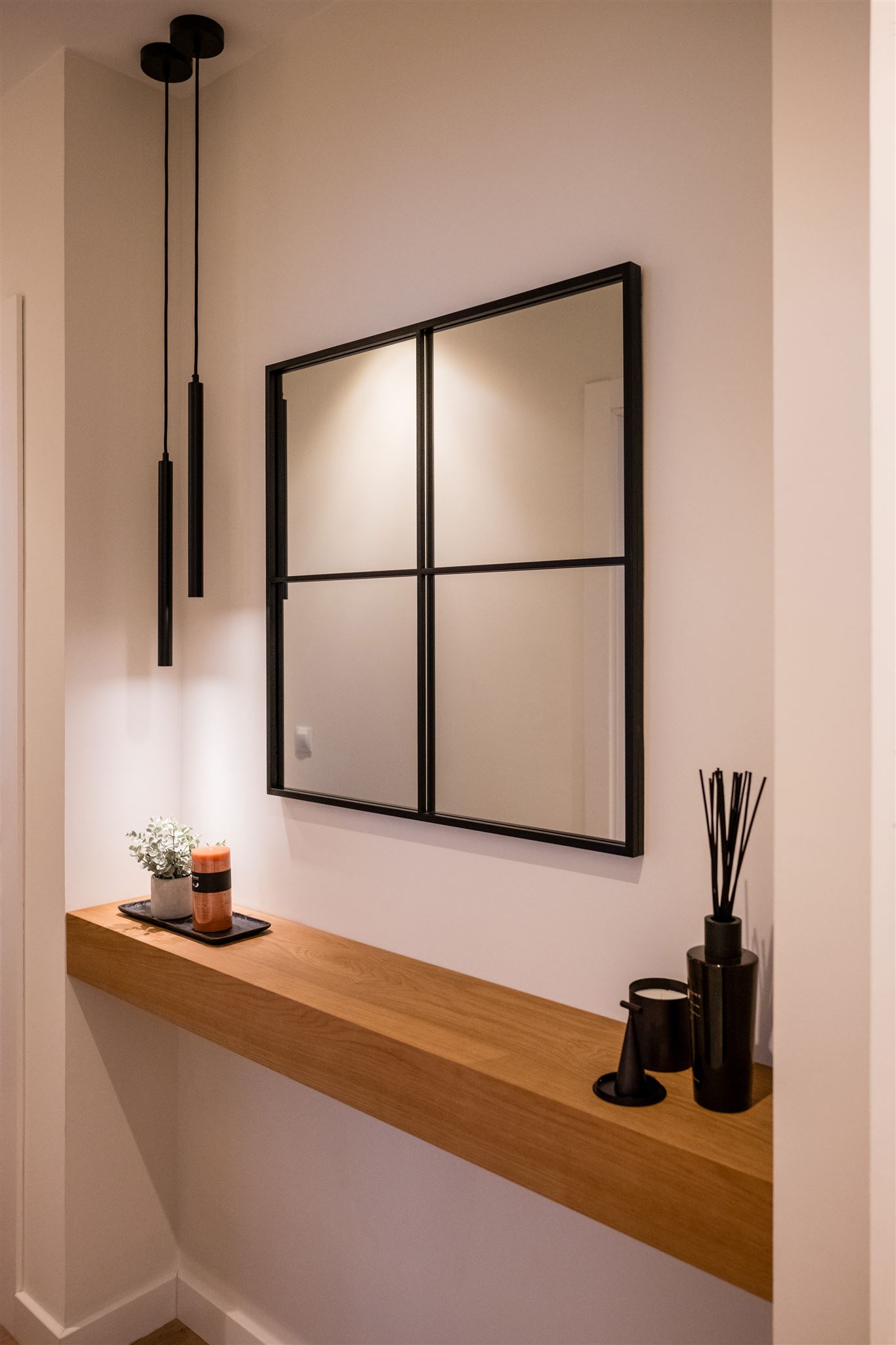 Comenzamos con un recibidor protagonizado por un juego de lámparas de ambiente muy especiales y un gran espejo que aporta profundidad y luminosidad.