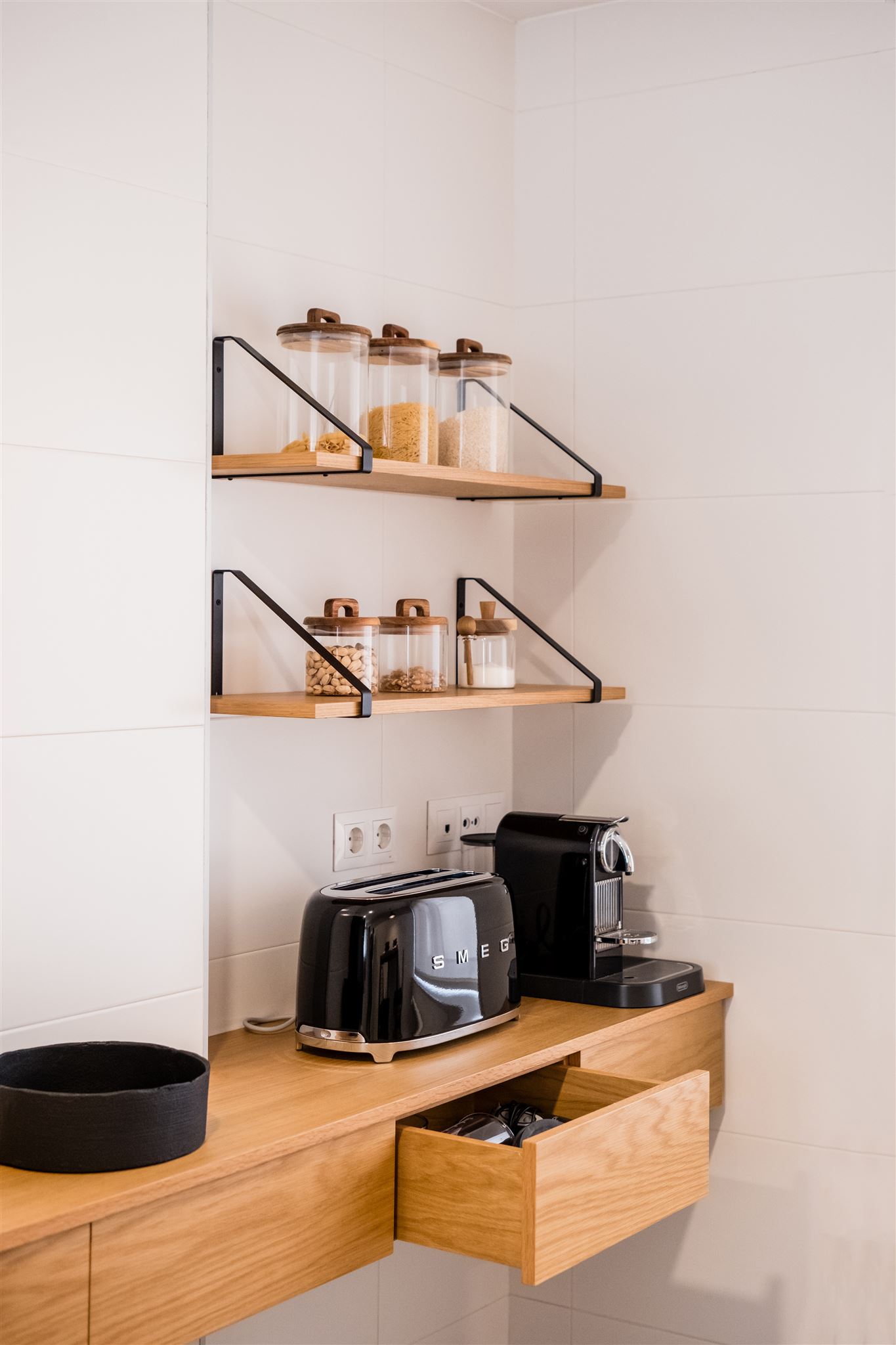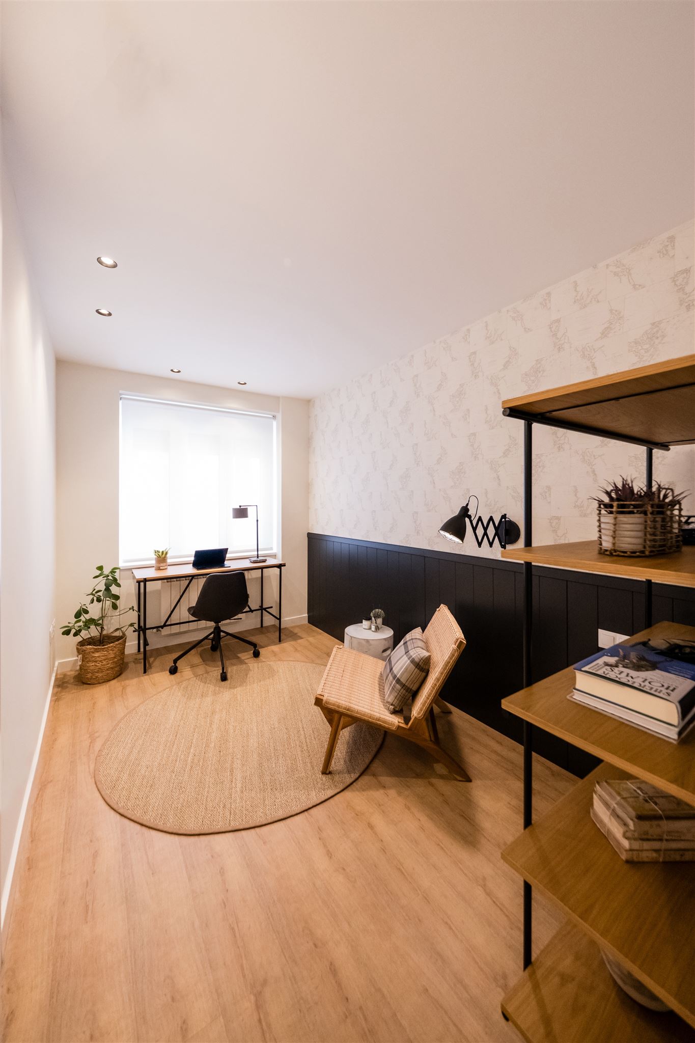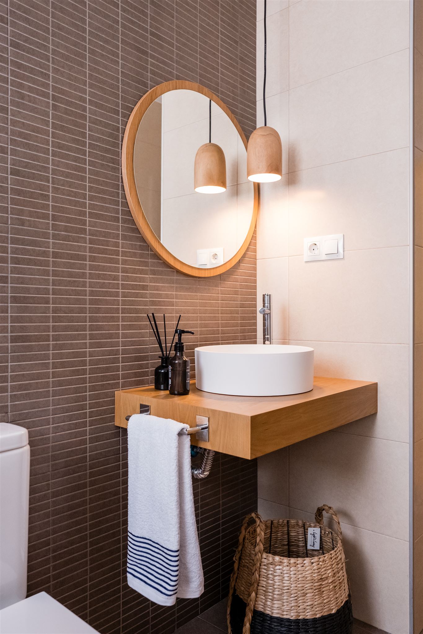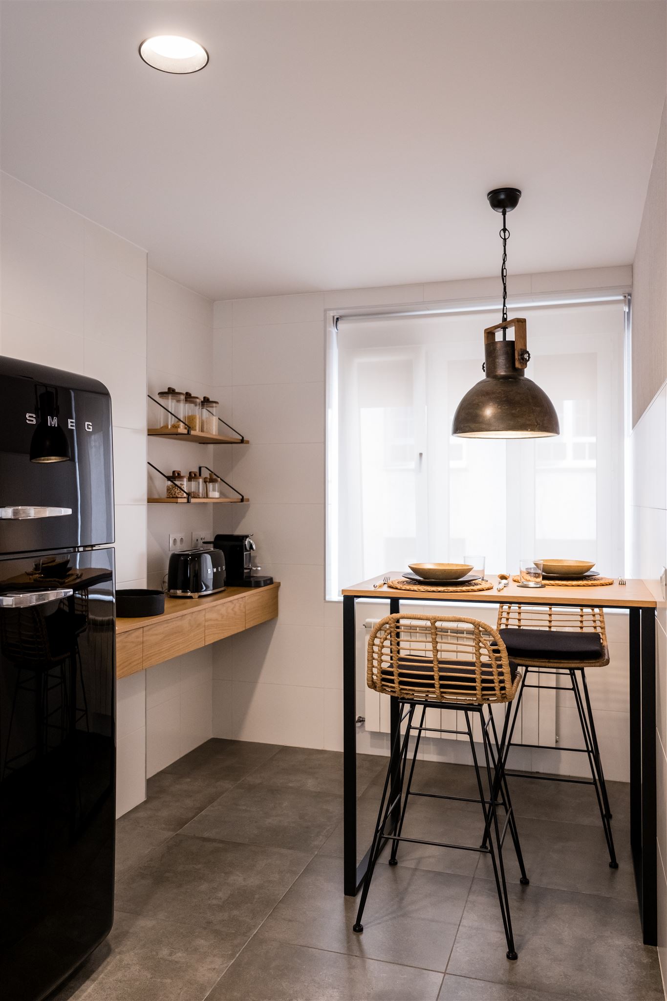 Continuamos con la cocina, en la que apostamos por una mesa alta para aprovechar así el espacio al máximo. Justo encima, una lámpara en suspensión que aporta mucha luz y personalidad. Resaltamos la utilización de madera y una paleta de colores unificada para todo el espacio.