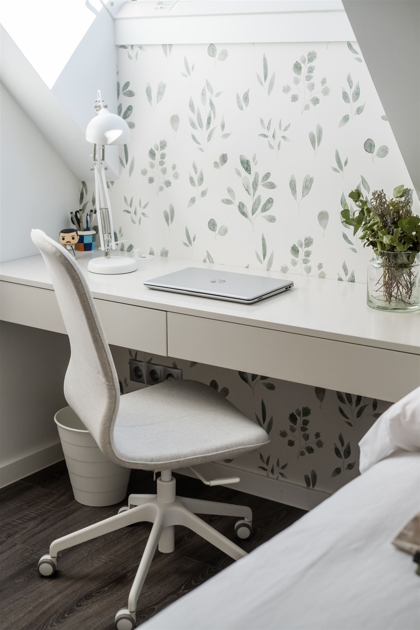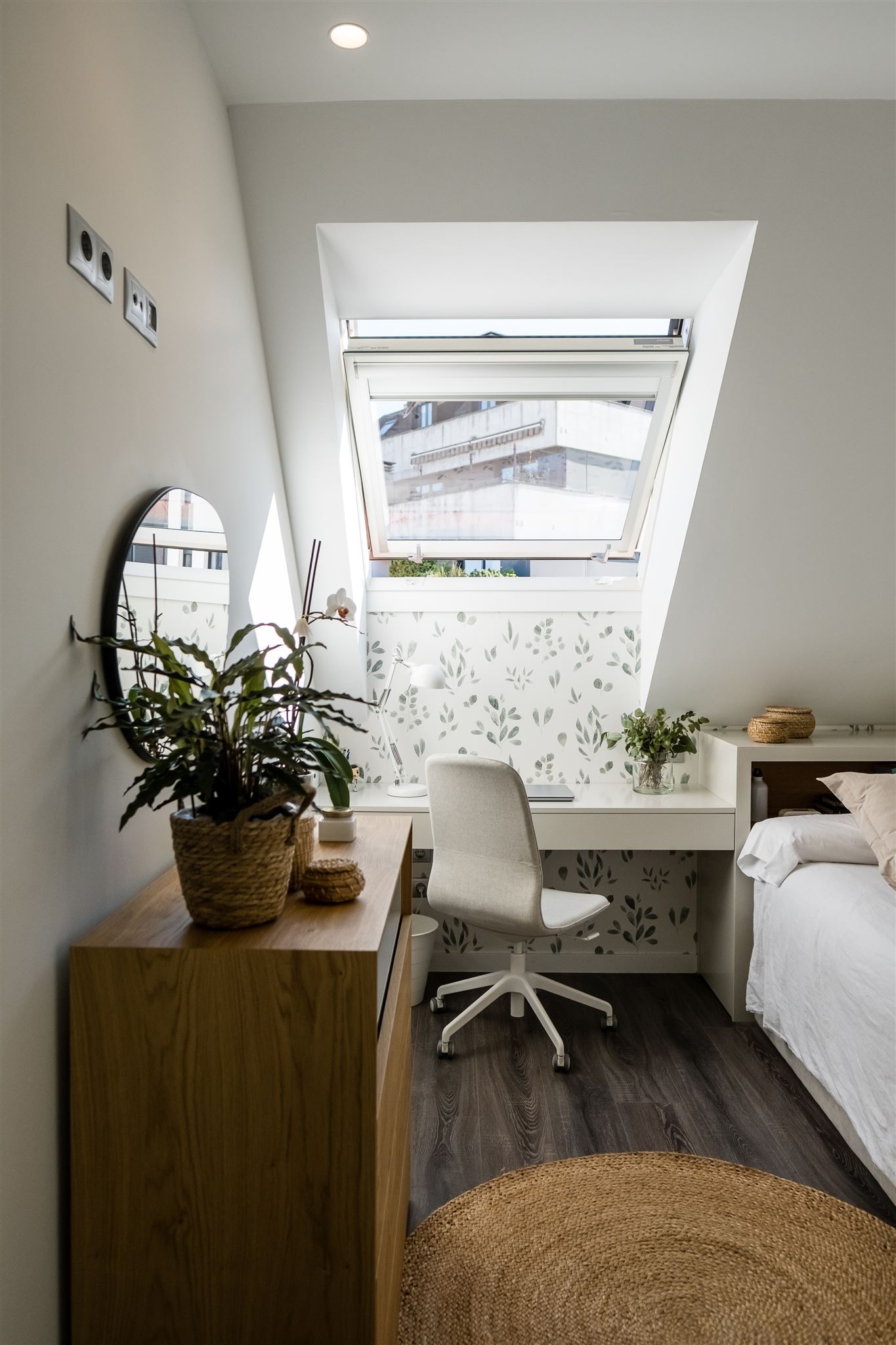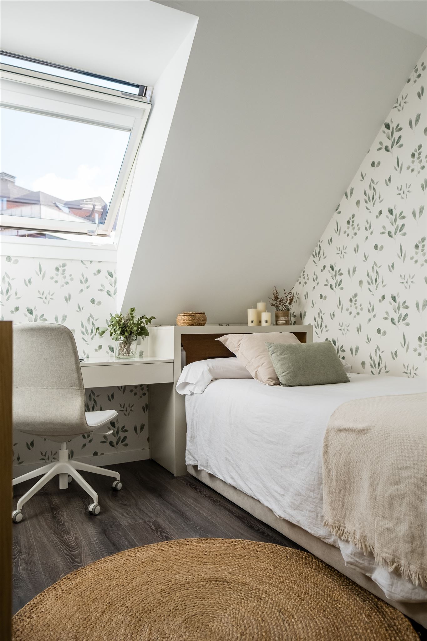 Uno de los aspectos más destacables en el dormitorio juvenil, es el mobiliario hecho a medida ya que ha sido diseñado para aprovechar al máximo cada rincón y espacio disponible, optimizando el almacenamiento y la funcionalidad.