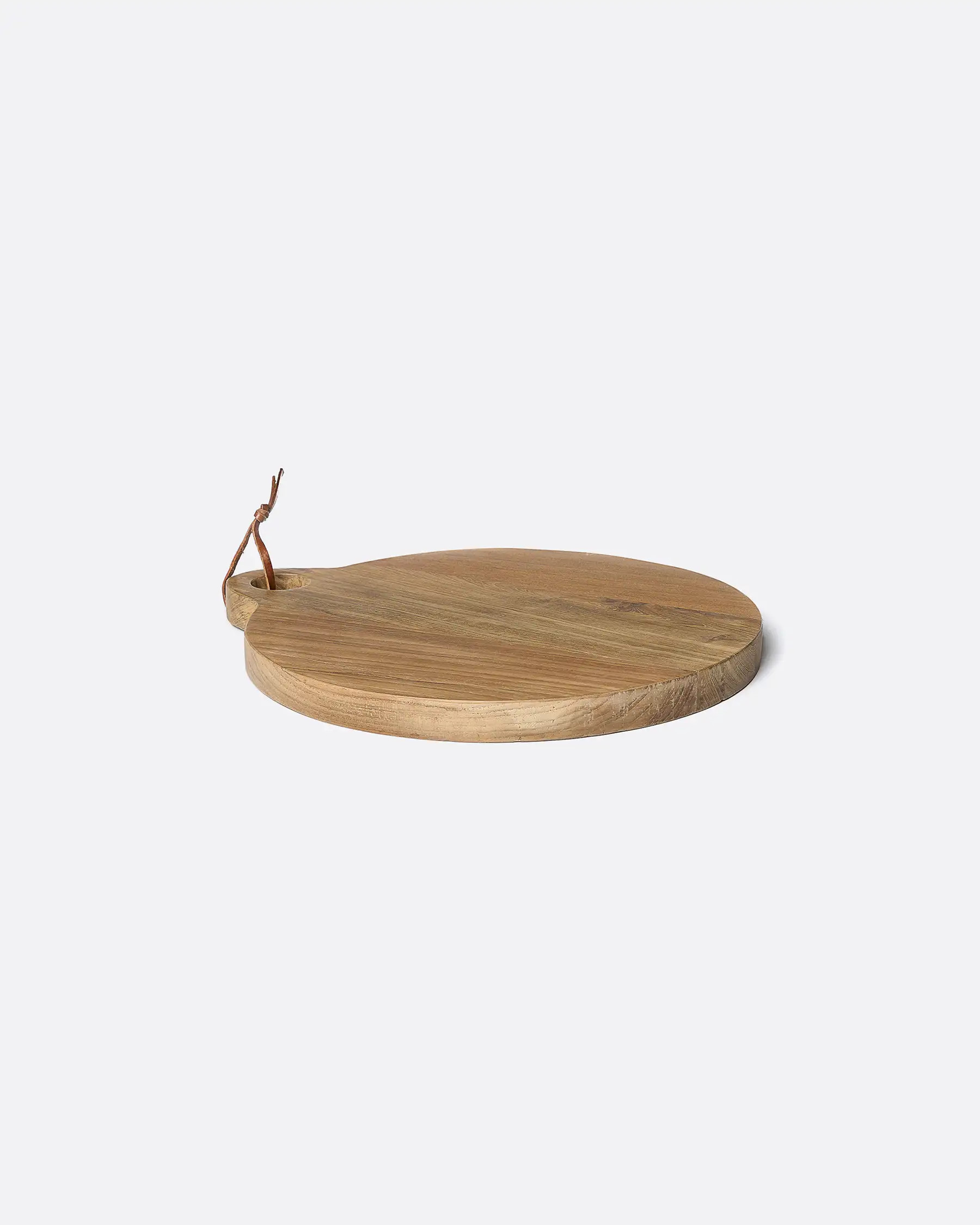 La tabla de corte RODOL, elaborada en teca reciclada y diseñada en forma circular, tiene un acabado liso natural que realza el bello veteado de la madera. Dispone de un orificio lateral con cordel de piel incorporado para colgarla fácilmente. Forma parte de nuestra colección de utensilios de cocina, sostenibles y muy duraderos.