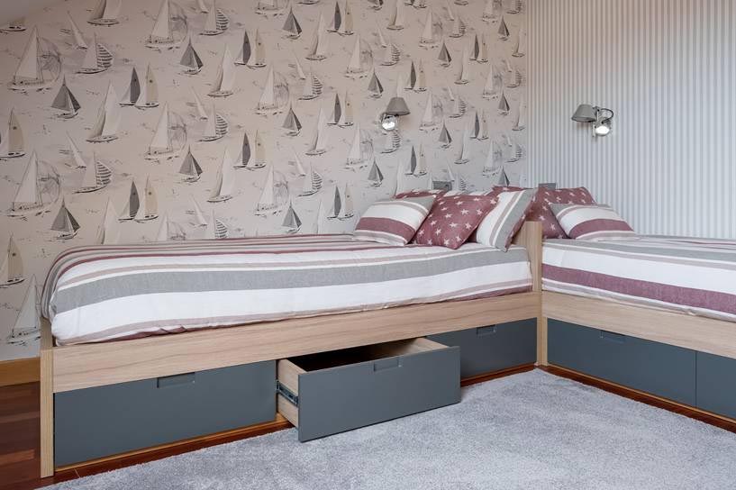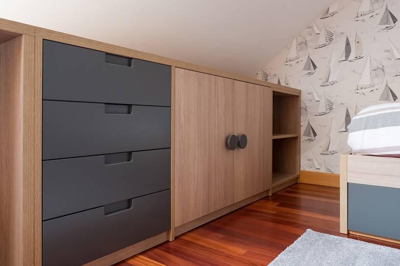 Todo el mobiliario, creado por Ebanistería Puente, ha sido diseñado para optimizar el espacio buscando las mejores soluciones como los grandes cajones bajo la cama ideales para almacenamiento.