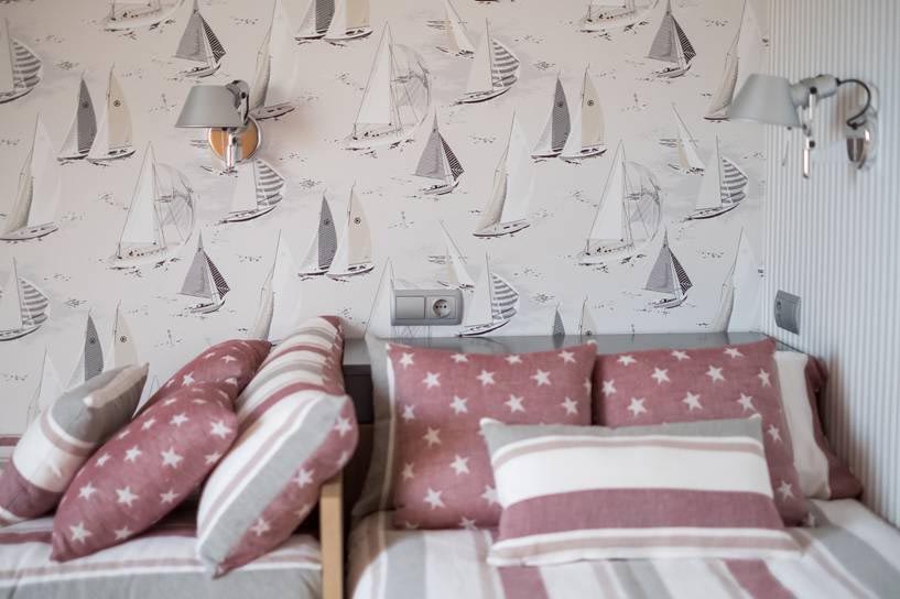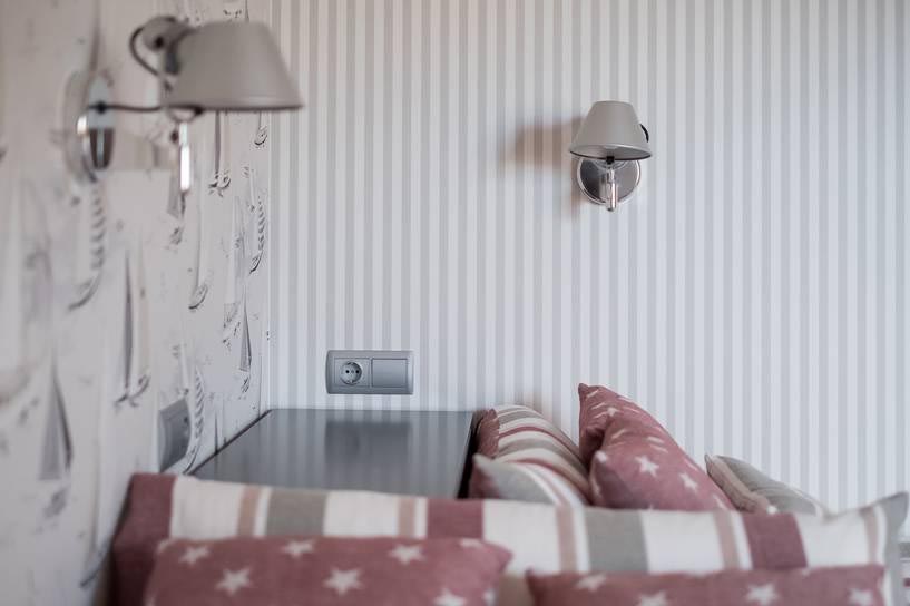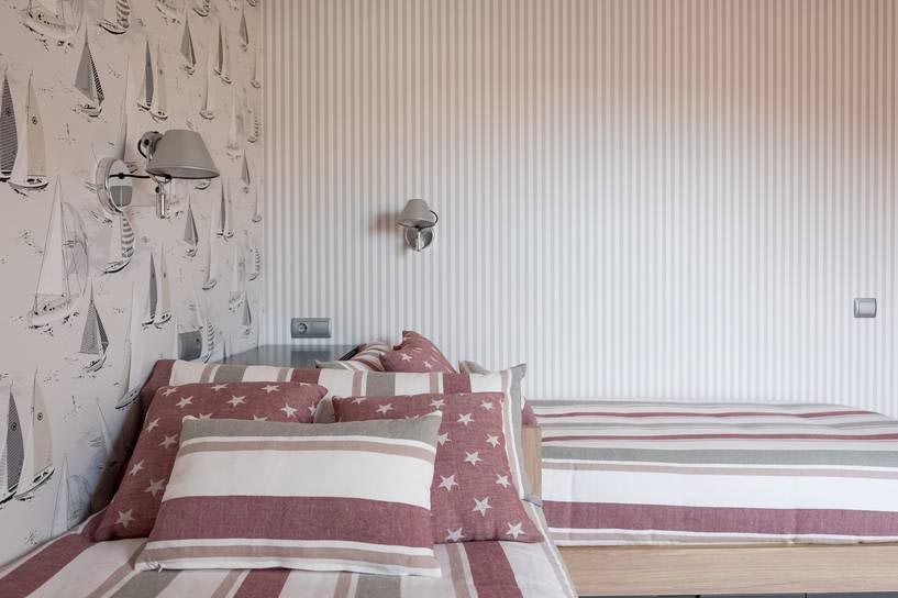 Para la decoración Dernier ha optado por tonos suaves y neutros que inviten al relax y que armonizan con la alfombra de KP con tratamiento especial para las manchas. Todo un conjunto armonioso enriquecido con el papel de la pared y la ropa de cama de Coordonné y los flexos de pared Tolomeo de Artemide.